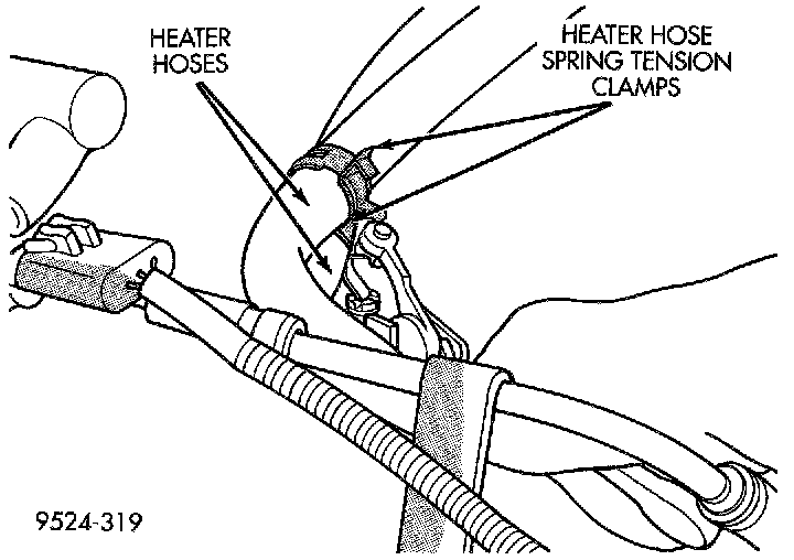 The heater hoses attach at the engine compartment cowl onto the heater core inlet/outlet and on the left side of the engine.REMOVAL