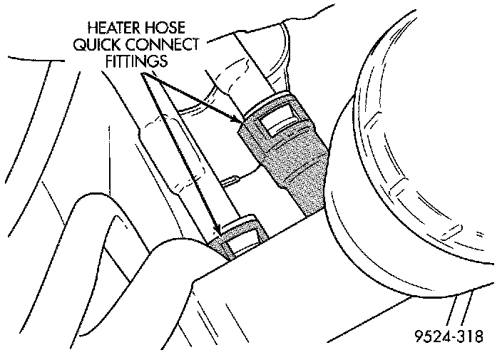 The heater hoses are preformed hoses with quick connect fittings at the engine. These hoses are not serviceable and must be replaced using OEM parts. The hoses are attached at the heater core using spring tension clamps.