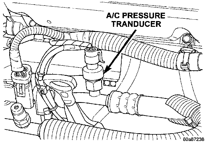 The pressure transducer is screwed attached to a valve on the discharge line near the compressor.