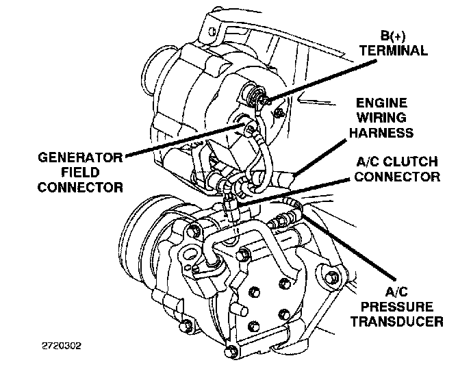 Generator Field Connector, B(+) Terminal, Engine Wiring Harness, A/C Clutch Connector, A/C Pressure Transducer: