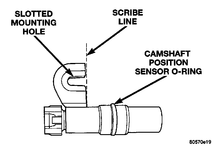 6. Install the sensor into the timing case/cover with a slight rocking action until the sensor is aligned to scribe line.