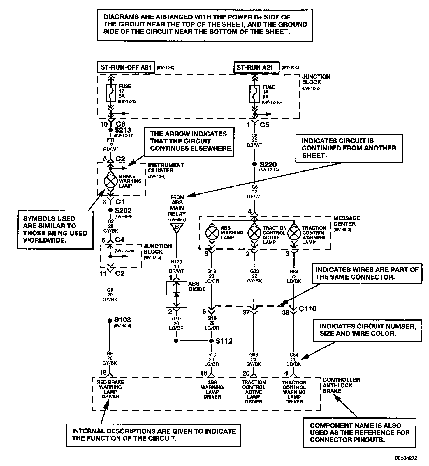 Diagrams are arranged such that the power (B+) side of the circuit is placed near the top of the sheet, and the ground (B-) side of the circuit is placed near the bottom of the sheet.