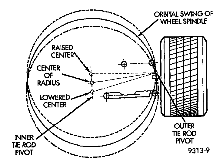 Wheel toe pattern is regulated by the vertical positioning of the inner tie rod pivot in relation to the orbital swing of the wheel spindle. Wheel toe settings have no effect on toe pattern. When the suspension is fully compressed and then extended with the tie rod disconnected from the spindle, the spindle makes an arc in space without altering the toe pattern. When the are of the spindle is extended into a full circle and the inner tie rod end is positioned in the center of the circle, the toe pattern cannot change. When the inner tie rod end is raised or lowered from the center of the true circle of the spindle arc, the toe pattern will vary. When the suspension is compressed (jounce), the wheel toe should change from normal riding height. When the suspension is extended (rebound), wheel toe should move in the opposite direction. The front suspension jounce should cause toe-out, rebound should cause toe-in. Rear suspension jounce should cause toe- in, rebound should cause toe-out.