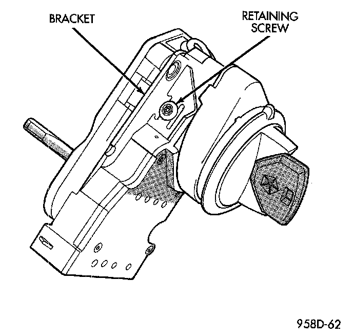 a. Insert key in ignition switch. Turn key to LOCK position. Using a TTXR20A2 or equivalent torx bit, remove key cylinder retaining screw and bracket.