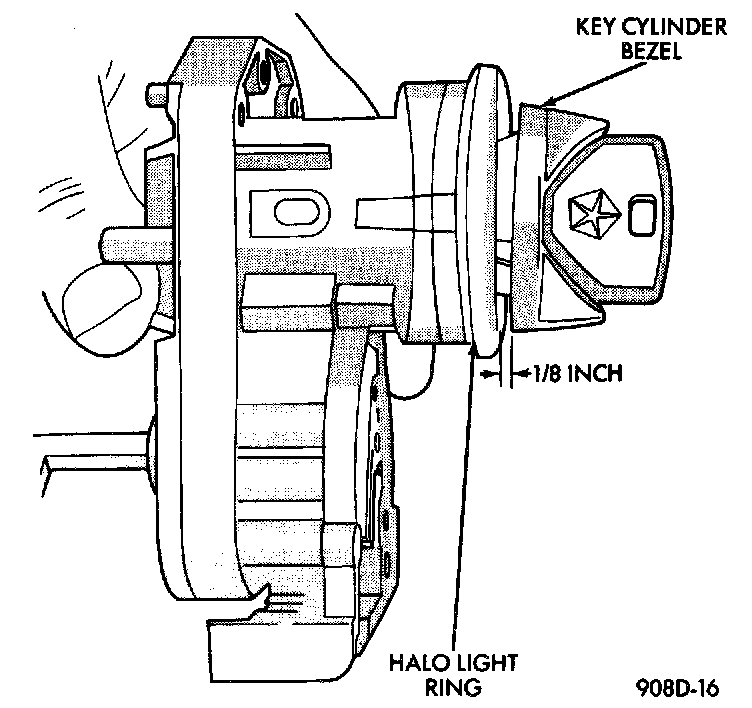 b. Rotate key clockwise to the OFF position. Key cylinder will unseat from ignition switch. When key cylinder is unseated, it will be approximately 1/8 inch away from ignition switch halo light ring. Do not attempt to remove key cylinder at this time.