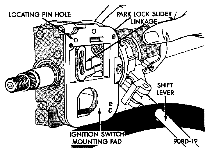 b. Position ignition switch park lock dowel pin so it will engage steering column park lock slider linkage.