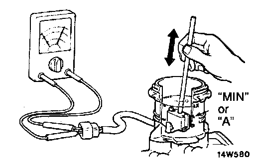 The brake fluid level sensor is in good condition if there is no continuity when the float surface is above "MIN" or "A" and if there is continuity when the float surface is below "MIN" or "A"