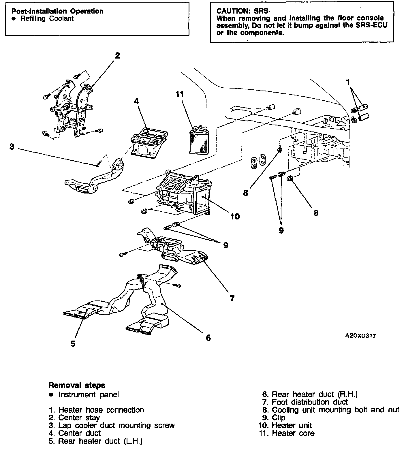 CAUTION: When removing and Installing the floor console assembly, Do not let it bump against the SRS-ECU or the components.