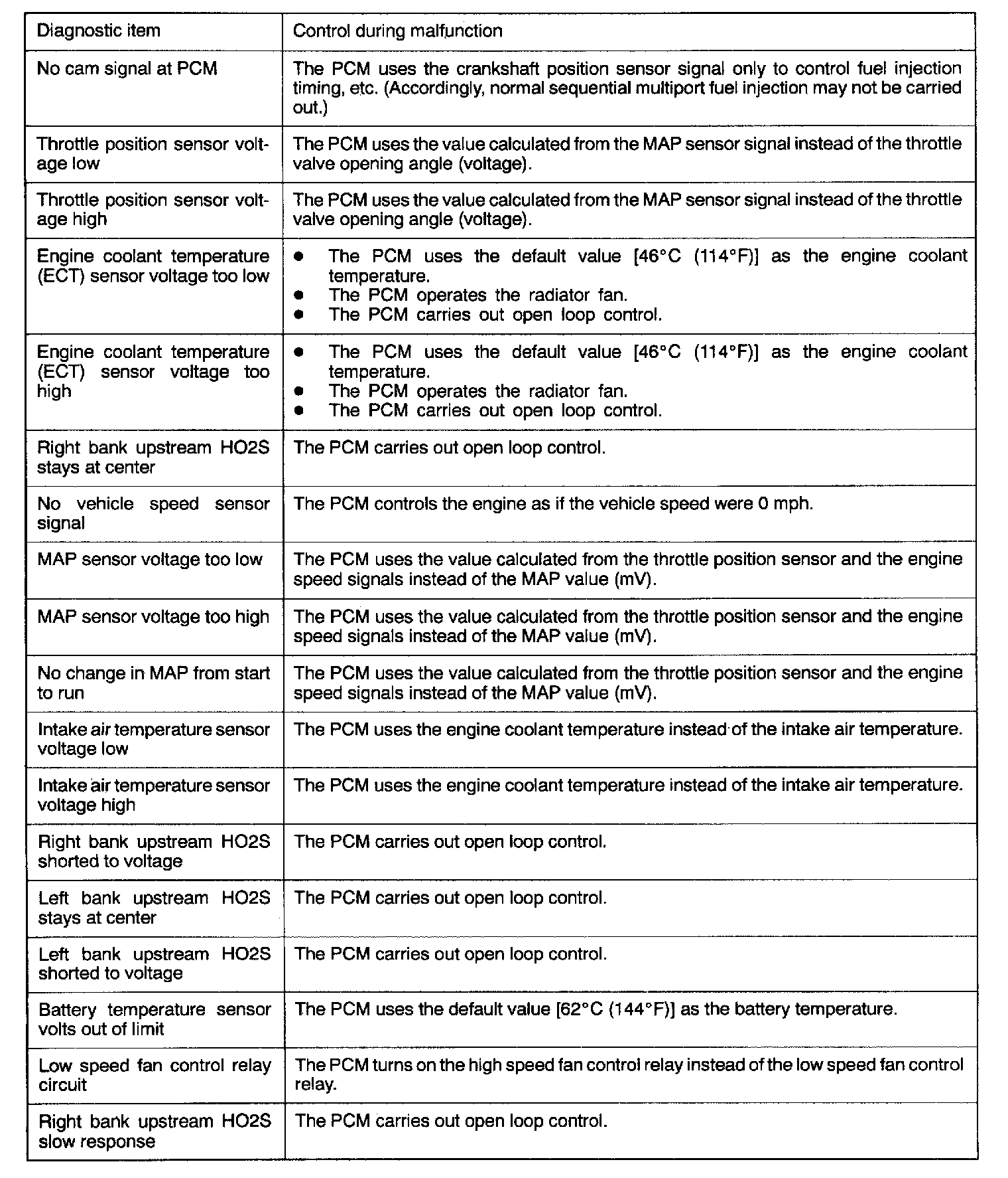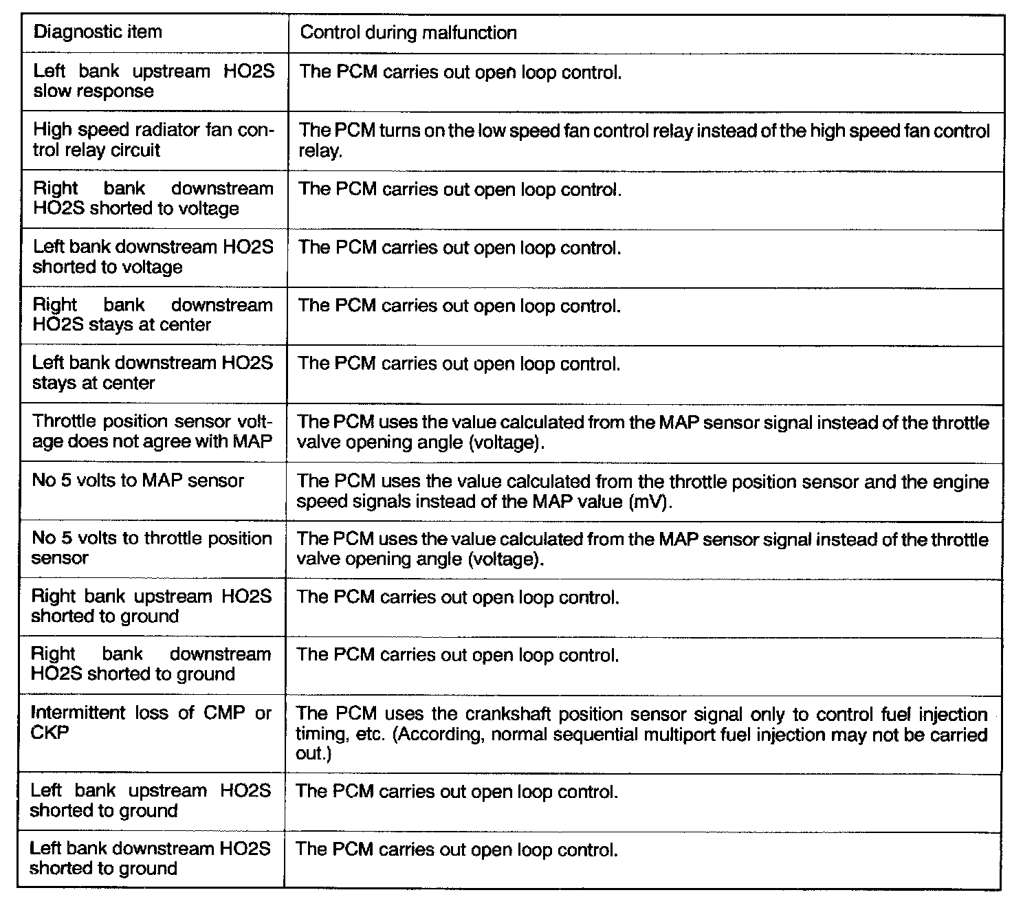 When the PCM detects the following malfunction(s), the PCM carries out fail safe/back-up control. In addition, the corresponding DTC number(s) can be identified by using the scan tool.