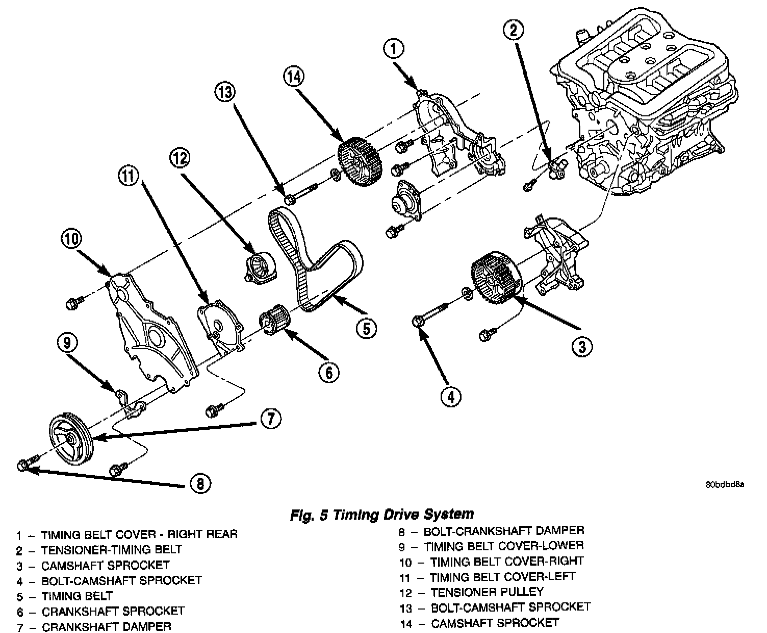 The timing drive components include a crankshaft sprocket, camshaft sprockets, tensioner pulley, hydraulic tensioner and a timing belt. The water pump is driven by the back side of the timing belt. The right and left camshaft sprockets are not interchangeable because of the cam sensor pick-up wheel on the left sprocket.
