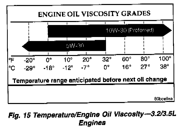 An SAE viscosity grade is used to specify the viscosity of engine oil. Use only engine oils with multiple viscosities such as 5W-30 or 10W-30. The preferred viscosity oil for the 3.2/3.5L engine is 10W30. These oils are specified with a dual SAE viscosity grade which indicates the cold-to-hot temperature viscosity range. Select an engine oil that is best suited to your particular temperature range and variation (Fig. 15).