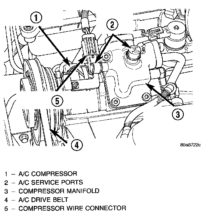 1. Remove the valve caps. Remove refrigerant from A/C system using a refrigerant recovery machine.