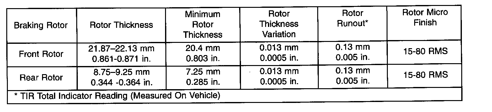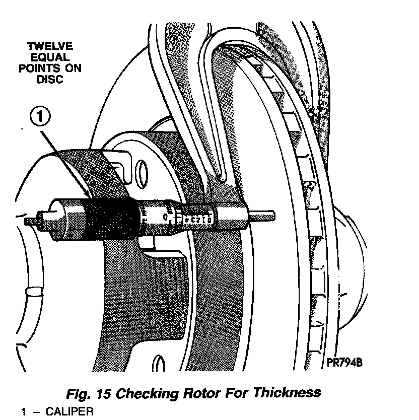 Rotor thickness variation measurements should be made in conjunction with measuring runout. Measure thickness of the brake rotor at 12 equal points around the rotor braking surface with a micrometer at a radius approximately 25 mm (1 inch) from edge of rotor. If thickness measurements vary by more than 0.013 mm (0.0005 inch), the rotor should refaced or replaced.