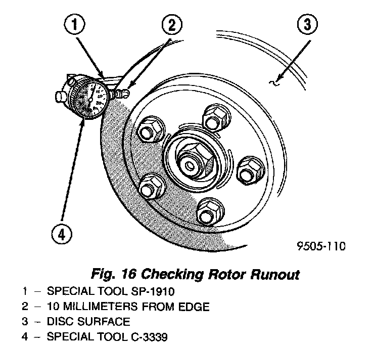 On-vehicle rotor runout is the combination of the individual runout of the hub face and the runout of the rotor. (The hub and rotor runouts are separable). To measure rotor runout on the vehicle, first remove the tire and wheel assembly. Reinstall the wheel mounting nuts on the studs, tightening the rotor to the hub. Mount the Dial Indicator, Special Tool C-3339, with Mounting Adaptor, Special Tool SP-1910 on steering arm. The dial indicator plunger should contact braking surface of rotor approximately one inch from edge of rotor. Check lateral runout on both sides of the rotor, marking the low and high spots on both. Runout limits can be found in the table at the end of this brake rotor information.
