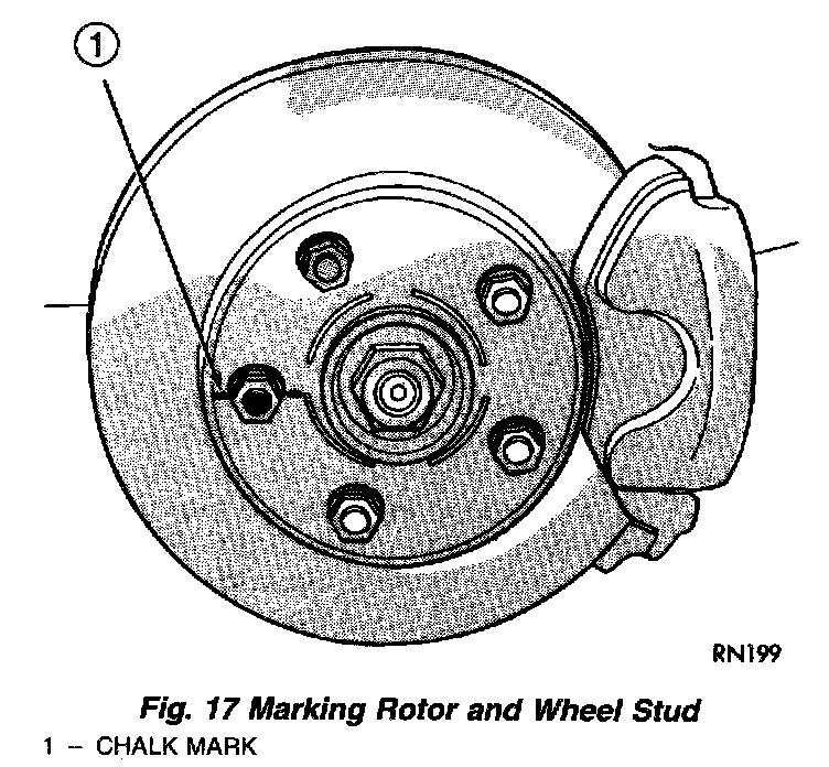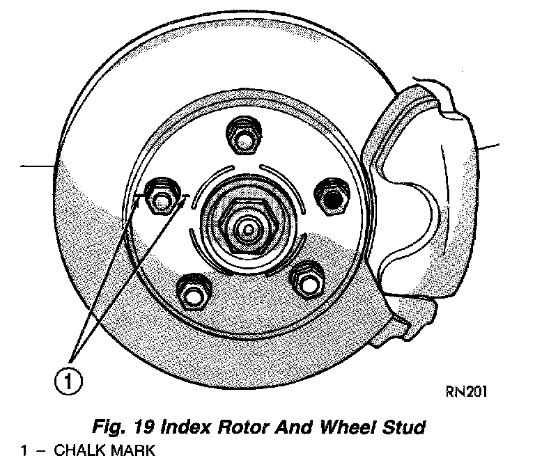 If the hub runout does not exceed this specification, install the rotor back on the hub, aligning the chalk marks on the rotor with a wheel mounting stud, two studs apart from the original stud. Tighten nuts in the proper sequence and torque to specifications.
