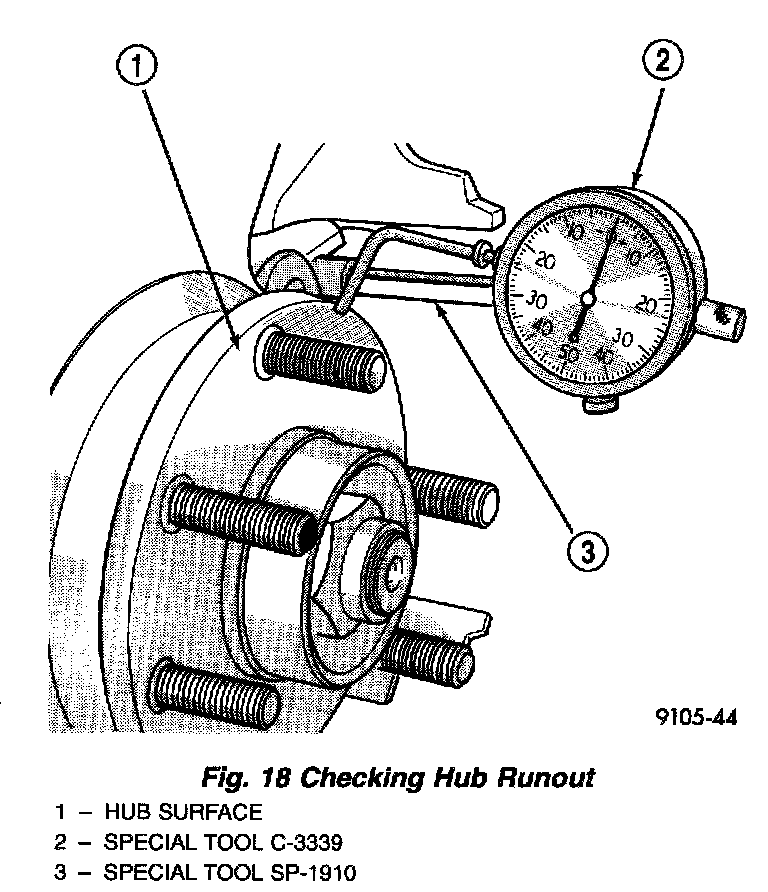 Mount Dial Indicator, Special Tool C-3339, and Mounting Adaptor, Special Tool SP-1910, to the steering knuckle. Position the indicator stem so it contacts the hub face near the outer diameter. Care must be taken to position stem outside of the stud circle, but inside of the chamfer on the hub rim.