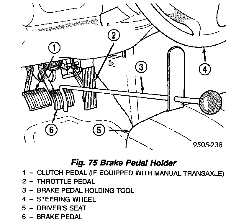 1. Using a brake pedal holding tool as shown, depress the brake pedal past its first one inch of travel and hold it in this position. This will isolate the master cylinder from the brake hydraulic system and will not allow the brake fluid to drain out of the master cylinder reservoir.