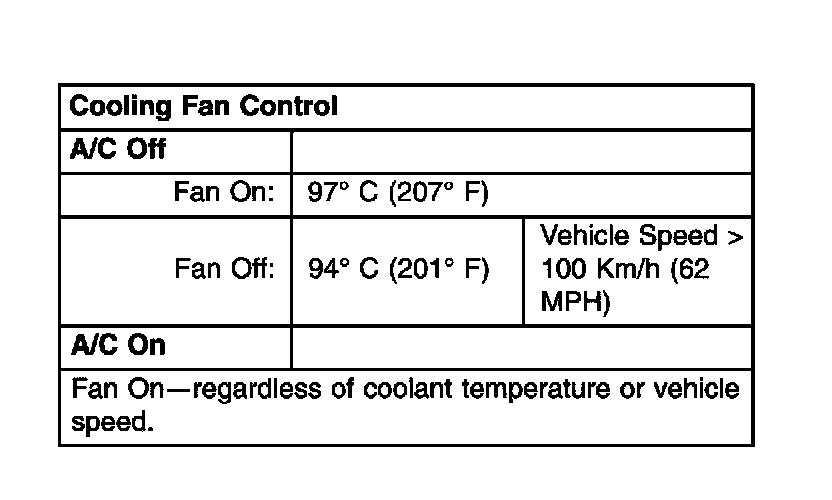 The PCM will actuate the fan relay whenever the A/C clutch is engaged regardless of coolant temperature and vehicle speed. If the A/C clutch is not engaged, the PCM will actuate the fan relay when the coolant temperature reaches approximately (97°C) 207°F and turns off the fan relay when the coolant temperature drops to approximately (94°C) 201°F. The fan relay is also turned off when the vehicle speed is above approximately 100 Km/h (62 MPH).
