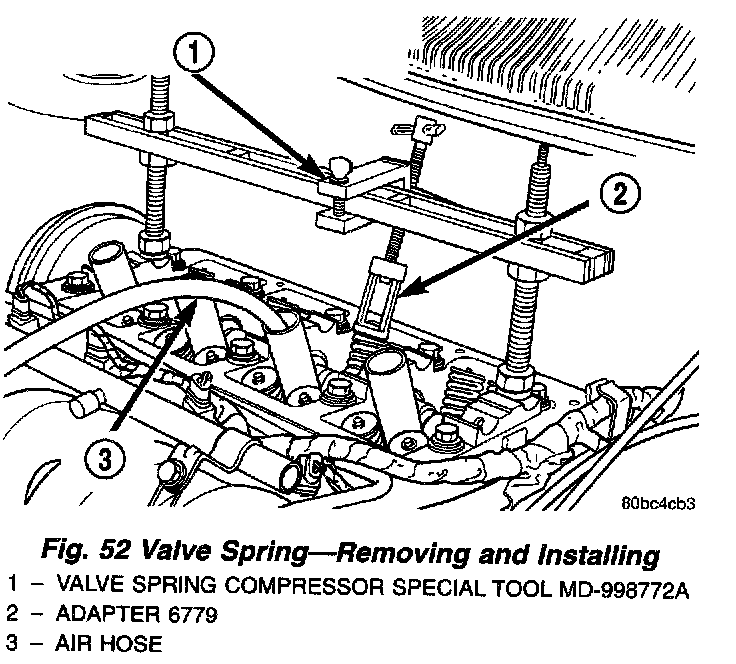 4. Using Special Tool MD-998772A with adapter 6779 (Fig. 52) compress valve springs and remove valve locks.