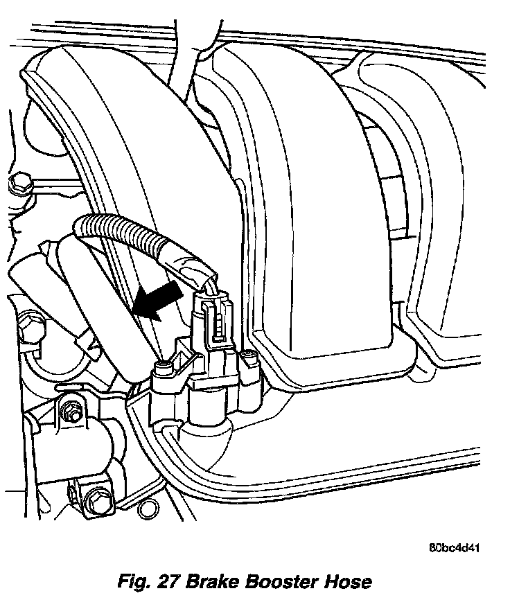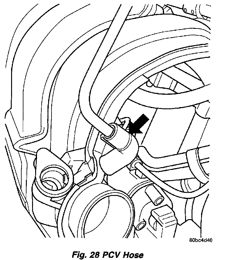 6. Disconnect brake booster hose (Fig. 27) and PCV hose (Fig. 28) from intake manifold.