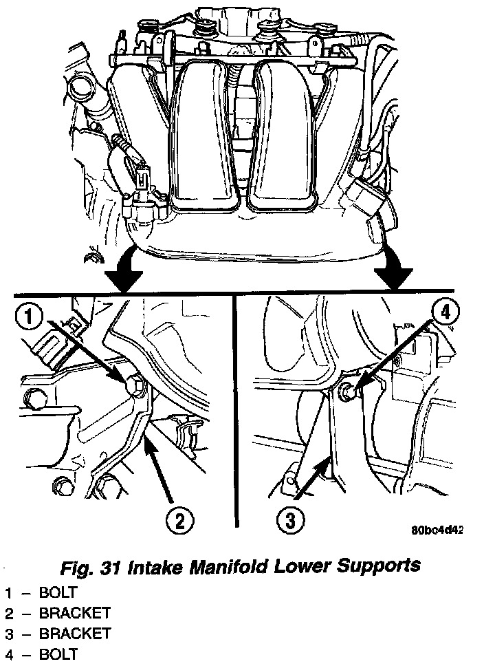 2. Install intake manifold to lower support bracket bolts (Fig. 31). Tighten bolts to 11 Nm (95 in. lbs.).