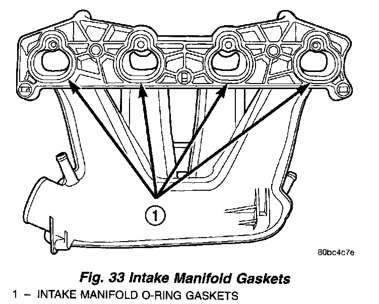 Before installing manifold. Clean all mating surfaces. Replace all O-ring gaskets with new gaskets (Fig. 33). All intake manifold fasteners and washers are to be discarded and NEW fasteners and washers are to be used.