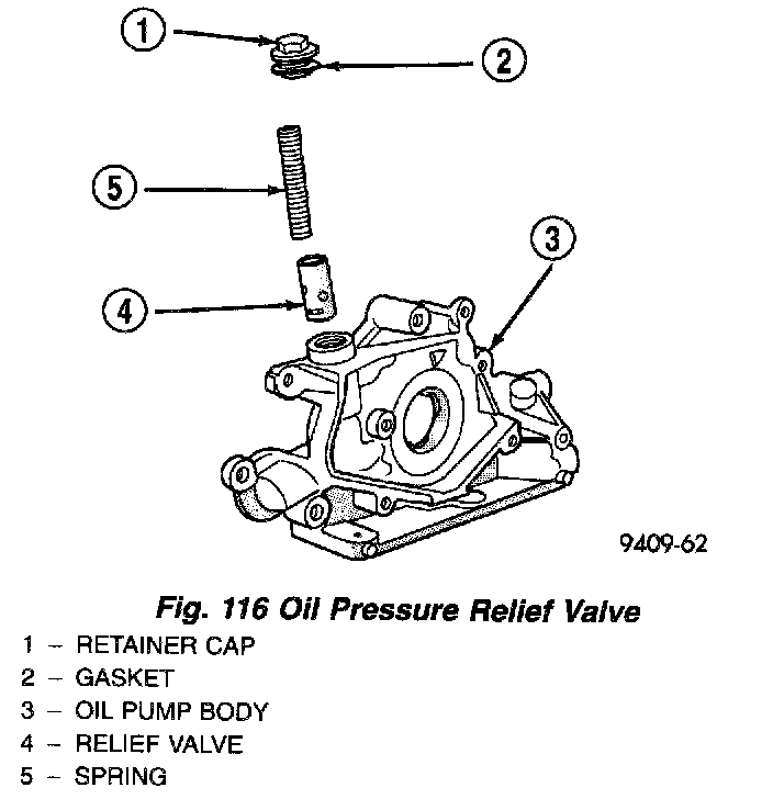 CAUTION: Oil pump pressure relief valve must be installed as shown in (Fig. 116) or serious damage may occur.
