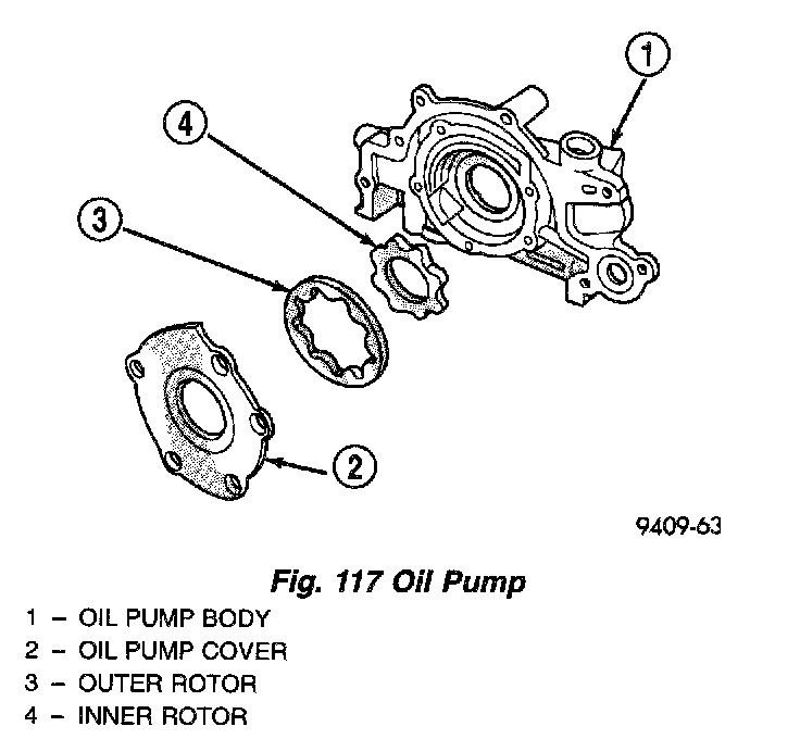 2. Remove the threaded plug and gasket from the oil pump (Fig. 116).