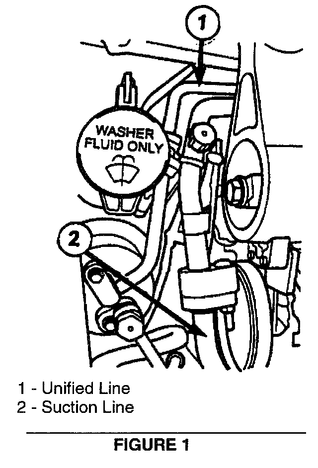 2. Remove and discard the A/C unified line by removing the bolt at the filter drier bottle, the bolt at the dash panel and the bolt at the suction port of the compressor. Do not remove the filter/drier bottle and liquid line. Do not leave the filter/drier bottle exposed to air for any length of time to prevent moisture contamination.