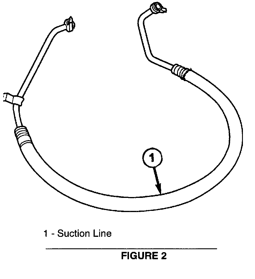 4. Install the new A/C suction line (p/n 05278761AB) and A/C unified line (p/n 05015344AC). The new suction line will use the alternate A/C compressor bolt hole. Torque the bolt at the dash panel to 22.5 Nm (200 in.lbs). Torque the nut/stud to 11.8 Nm (105 in.lbs). Torque the filter drier bolt to 11.2 Nm (100 in.lbs). Torque the A/C compressor bolt to 12.2 Nm (108 in.lbs). (Figures 1 and 2).