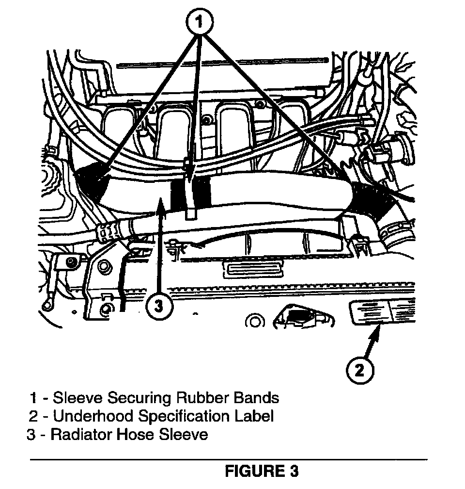 7. Install the radiator hose sleeve (05017627AA) by sliding the braided sleeve over the hose. Secure the hose with the three rubber bands provided (Figure 3).