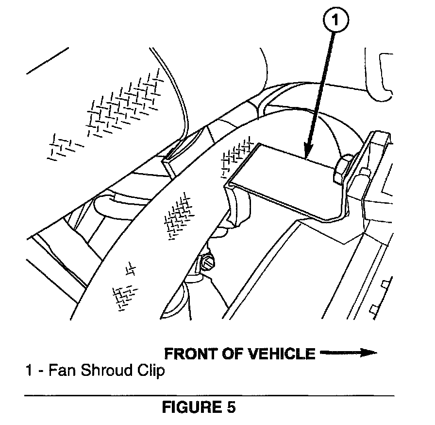 9. Install the fan shroud clip (p/n 05278762AA) with the existing left side cooling fan shroud mounting bolt and torque to 7.3 Nm (65 in.lbs) (Figure 5).