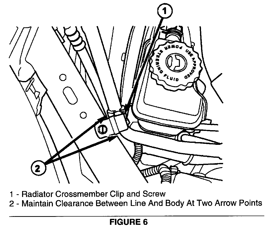 ENSURE THAT THE PILOT HOLE IS POSITIONED SO THAT THE CLIP DOES NOT CONTACT THE POWER STEERING RESERVOIR (FIGURE 6). ALSO ENSURE THAT THE ALUMINUM TUBING DOES NOT CONTACT THE SHEET METAL OR A BUZZ MAY OCCUR.
