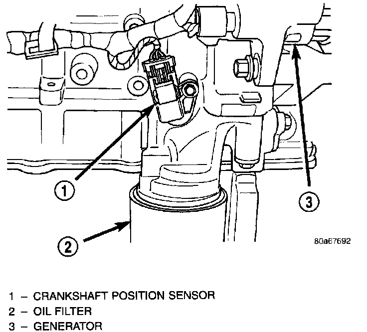 The Crankshaft Position Sensor mounts to the engine block behind the generator, just above the oil filter.