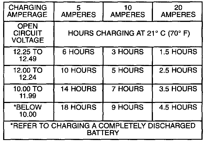 A completely discharged large heavy-duty battery may require more recharging time than a completely discharged small capacity battery, refer to Battery Charging Timetable for charging times.