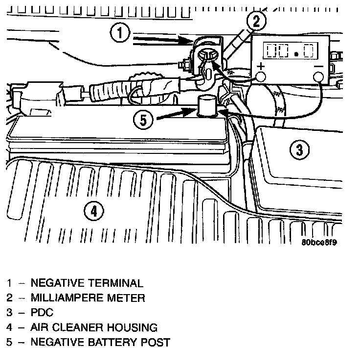 4. Use a multi-meter that has at least a range of 200 milliamperes. Install meter between the battery negative cable and battery negative post. Carefully remove the test lamp without disconnecting the meter. After all modules time-out the total vehicle IOD should be less than 10 milliamperes. If ignition off draw is more than 10 milliamperes go to Step 5.