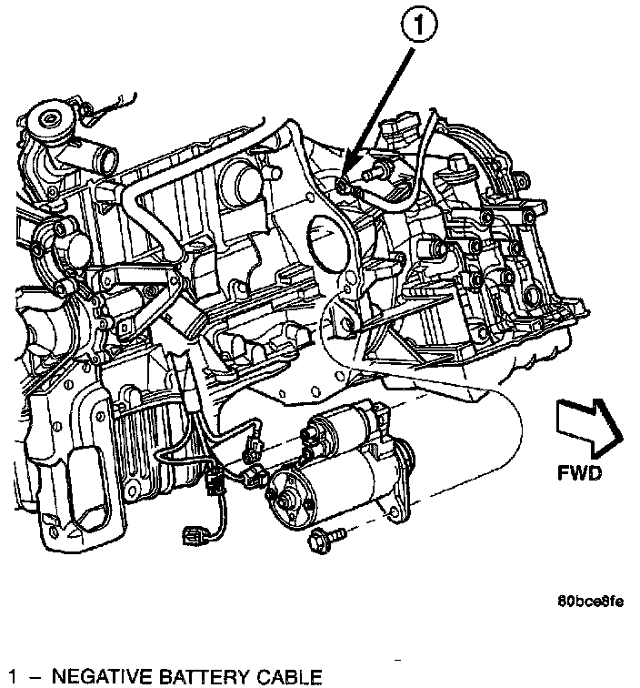 6. Remove battery positive connector from starter assembly. It is not necessary to remove the alternator output lead from the connector.