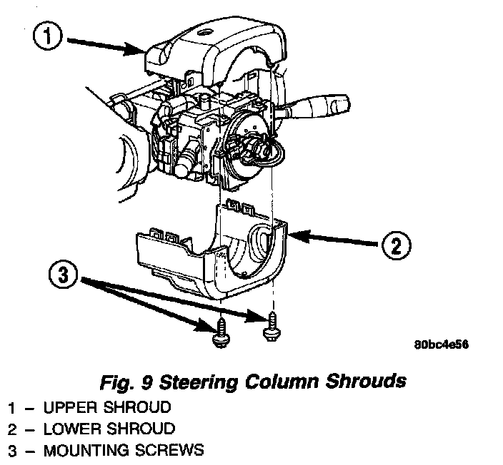 6. Remove the two screws along the bottom of the steering column cover that mounts below the steering column on the instrument panel. Disengage the clips on the upper end of the steering column cover and remove the cover by pulling it straight away from the instrument panel.