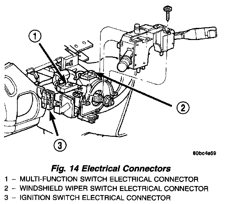 4. Connect the wiring harness electrical connectors to the multi-function switch, windshield wiper switch, and ignition switch.