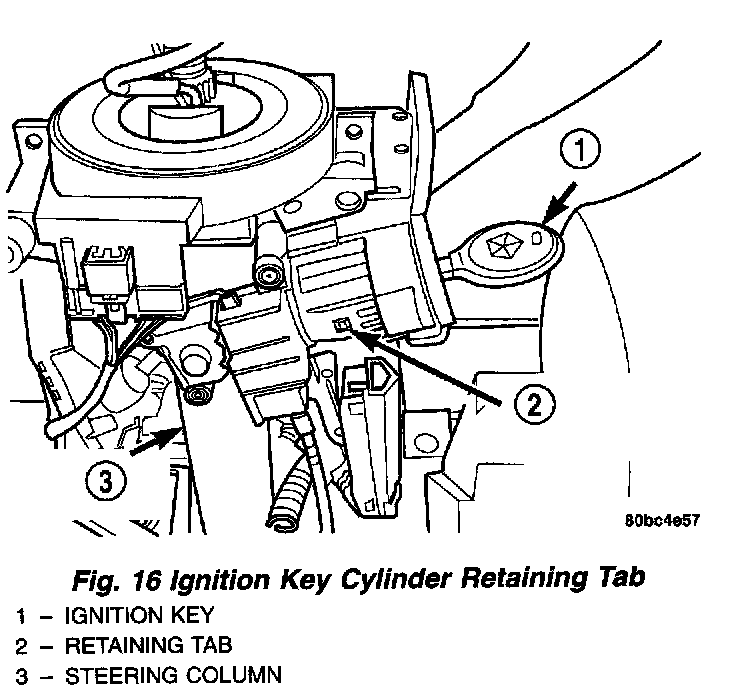 g. Install the ignition key cylinder in the steering column. To do this, first position the key cylinder in the ON position (with the key in it) so the retaining tab can be depressed. Push key cylinder into the column ignition cylinder housing until the retaining tab locks into place.