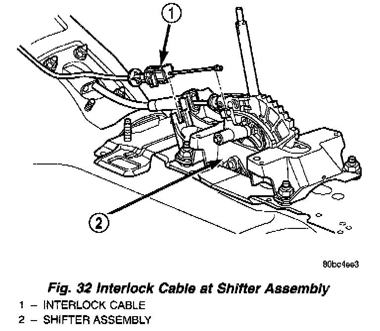 5. Disconnect the shifter/ignition interlock cable from the shifter lever and bracket as shown in (Fig. 32). Remove the cable core end from the plastic cam of the shifter mechanism and release cable from shifter bracket.