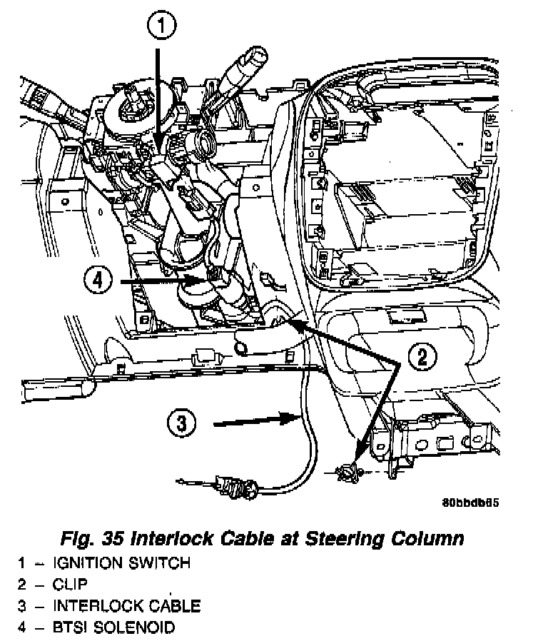 8. Disconnect the Brake Transmission Shift Interlock (BTSI) solenoid connector from the interlock cable (Fig. 35)
