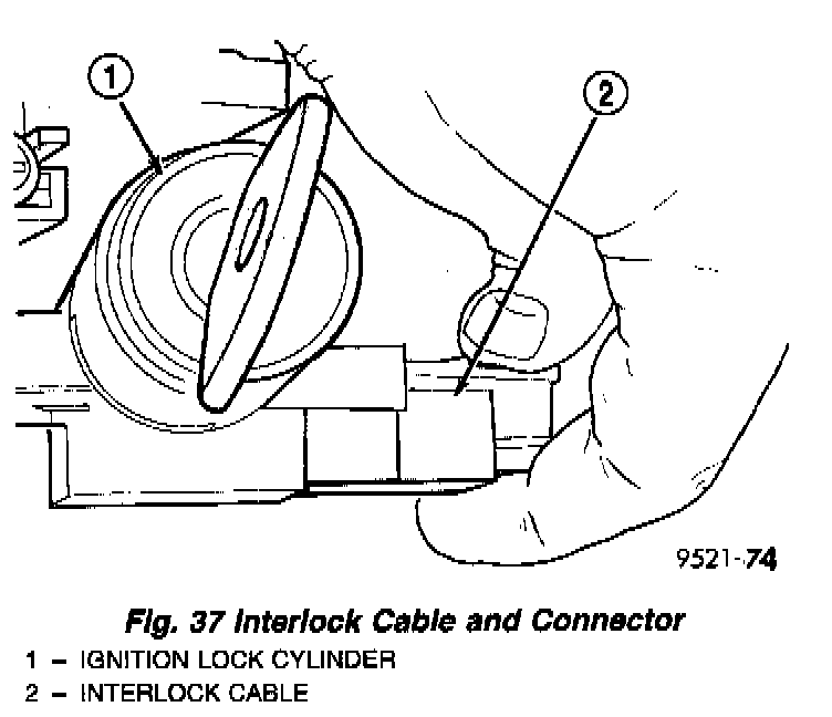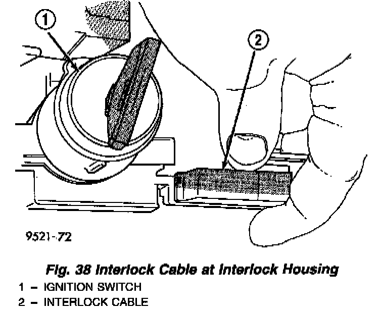 3. Install the interlock cable into the interlock housing at the steering column (Fig. 38). Verify the cable snaps into the housing and is fully seated.