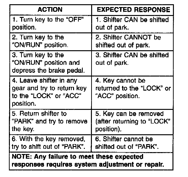 Brake Transmission Shift Interlock Expected Response Chart: