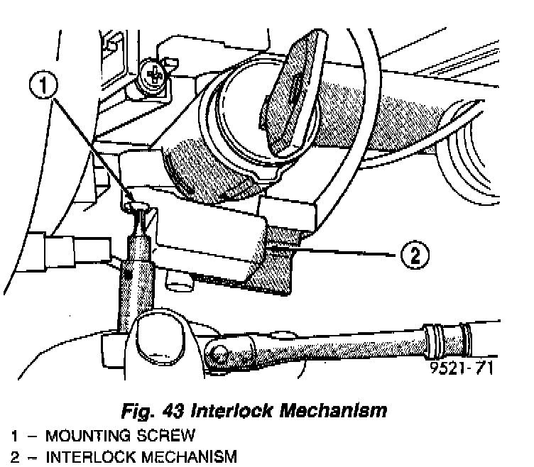 5. Remove the two interlock mechanism-to-steering column attaching screws (Fig. 43). Remove the interlock housing.