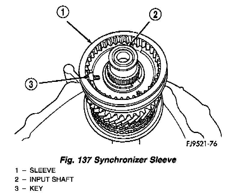 DISASSEMBLYPlace synchronizer in a clean shop towel and wrap. Press on inner hub. Carefully open up shop towel and remove springs, balls, keys, hub, and sleeve.
