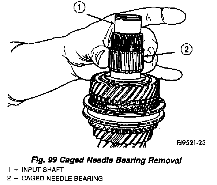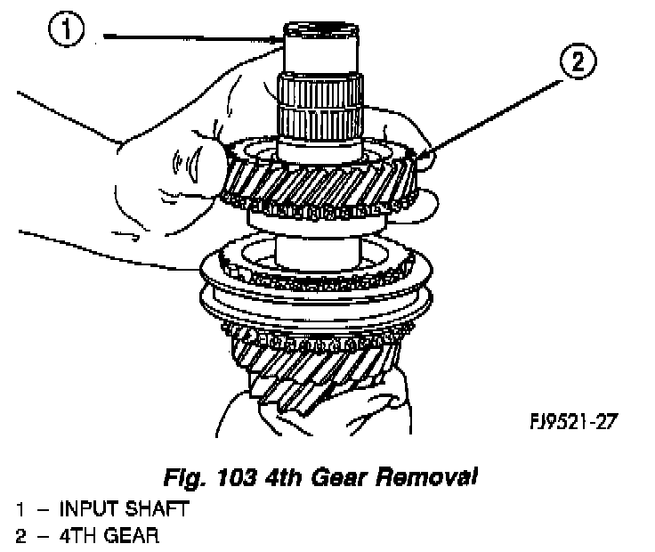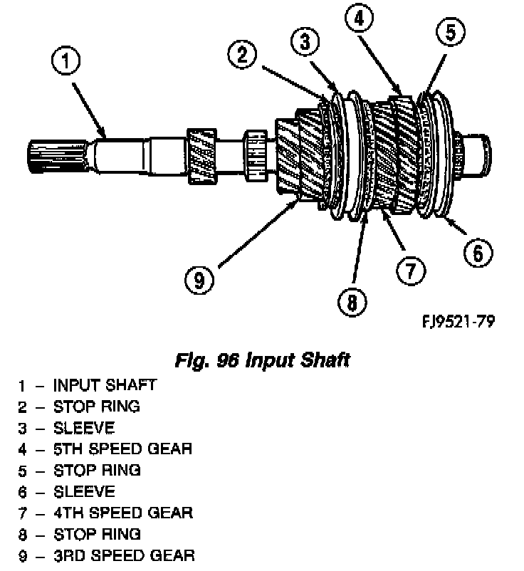 The input shaft incorporates the 3rd, 4th, and 5th speed gears and synchronizers on the assembly (Fig. 96).