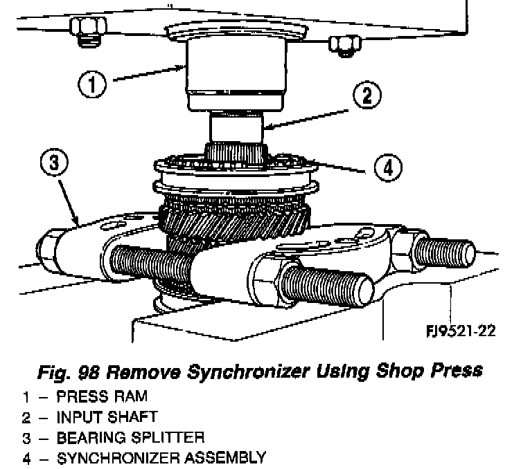 2. Remove synchronizer and gear using shop press (Fig. 98).