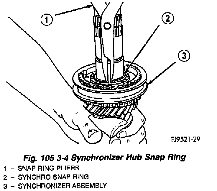 9. Remove blocking ring. Remove 3-4 synchronizer hub retaining snap ring (Fig. 105).
