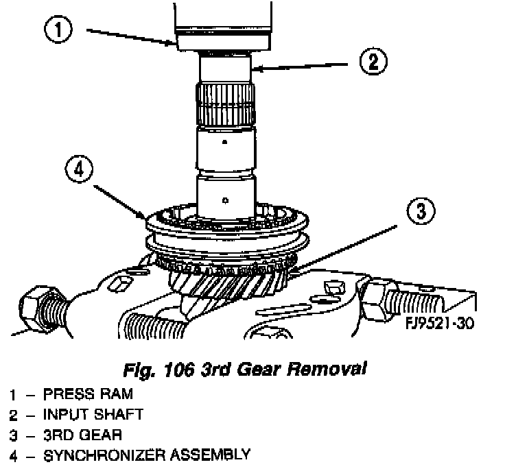 10. Install input shaft in shop press. Using bearing splitter, remove 3-4 synchronizer and 3rd gear (Fig. 106).